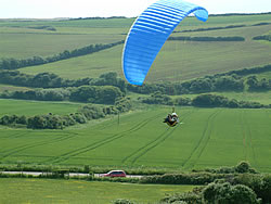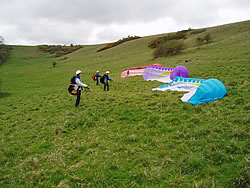 The main thing we need is not too much wind. If the wind on the hill is much over 15mph or particularly gusty then it will not be safe to train. Bear in mind that if the wind is forecast to be 13mph it will very likely be over 20mph on the hill top and therefore too windy. Very occasionally we get exceptionally light winds that may be too light for you, depending on where you are in the training programme. A little bit of dampness in the air doesn't necessarily stop training but if there is any proper rain or the grass is likely to stay wet all day, it will stop play. Early on in the season it can be that the ground is simply too wet and boggy for it to be fun for you or good for our equipment. When the wind is from the ENE to E we do not have useful training sites.